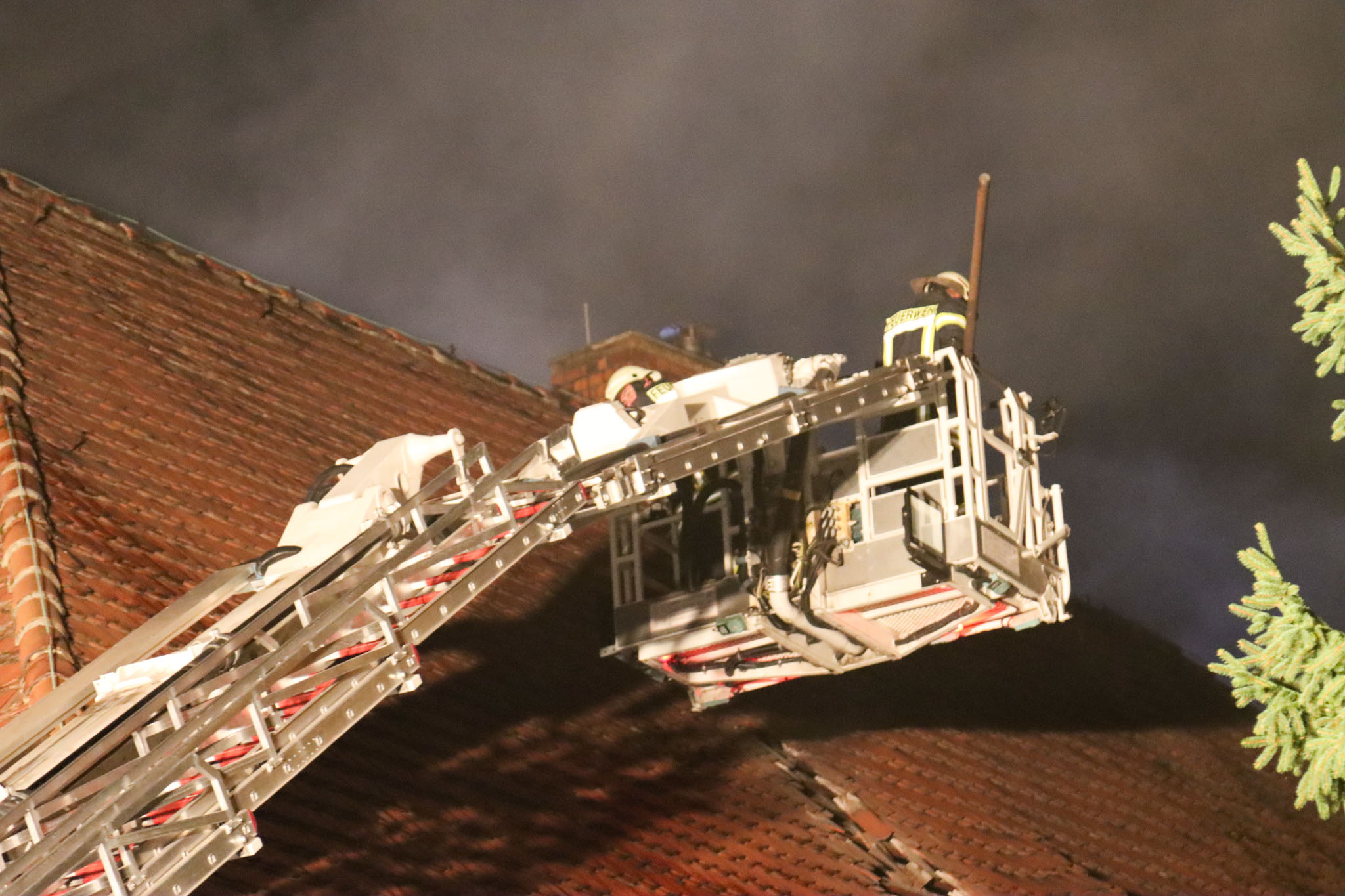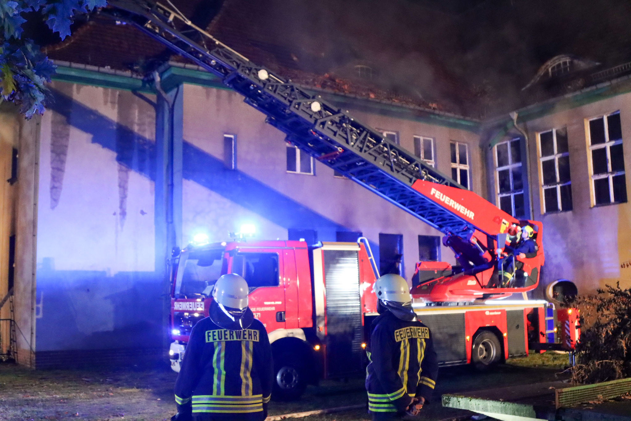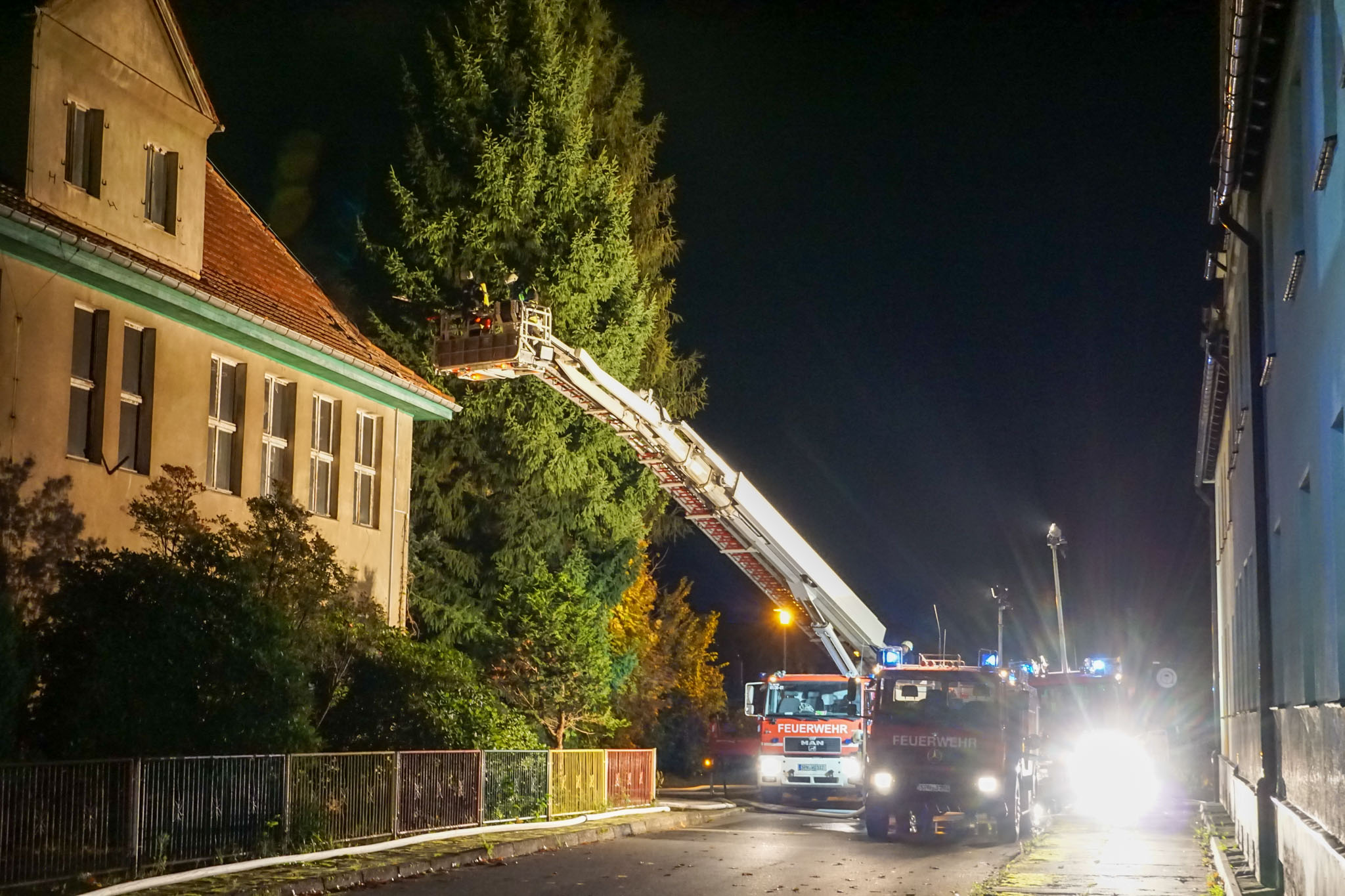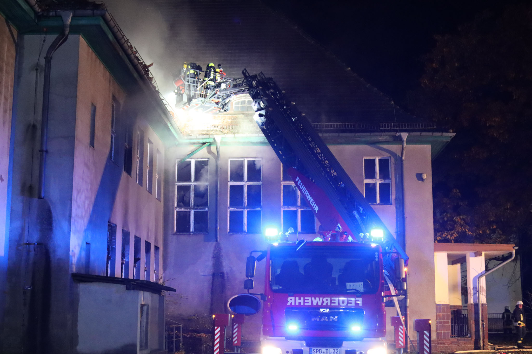 Aufgrund der starken Flammen und der maroden Bausubstanz war ein Innenangriff nicht mehr möglich. Die Feuerwehr konnte das Feuer nur von außen bekämpfen. Mit einer Drehleiter aus Spremberg und einem Teleskopmastfahrzeug der Feuerwehr Biomasse Wonneberger öffneten die Einsatzkräfte das Dach großflächig, um die Brandherde zu erreichen.