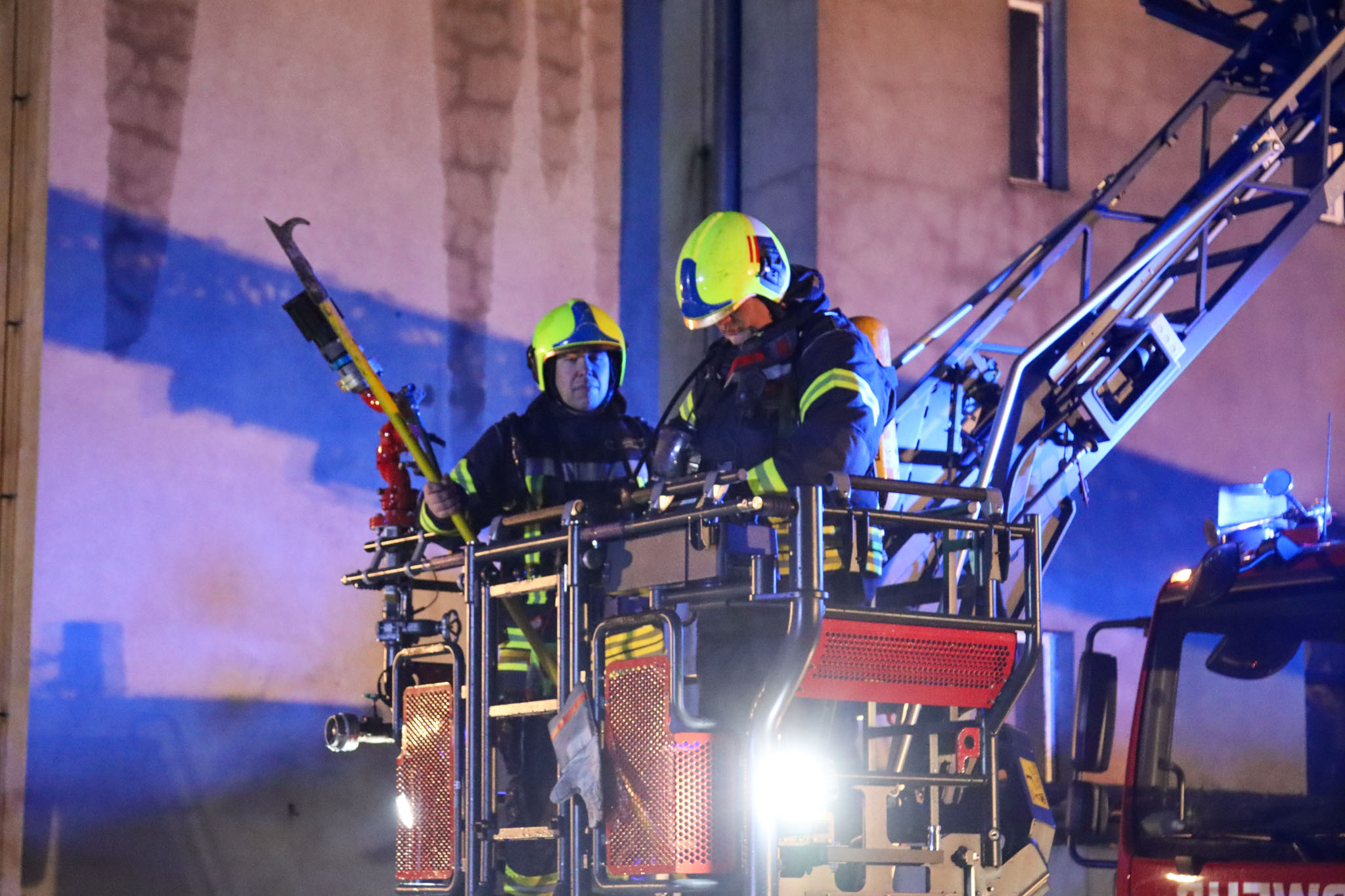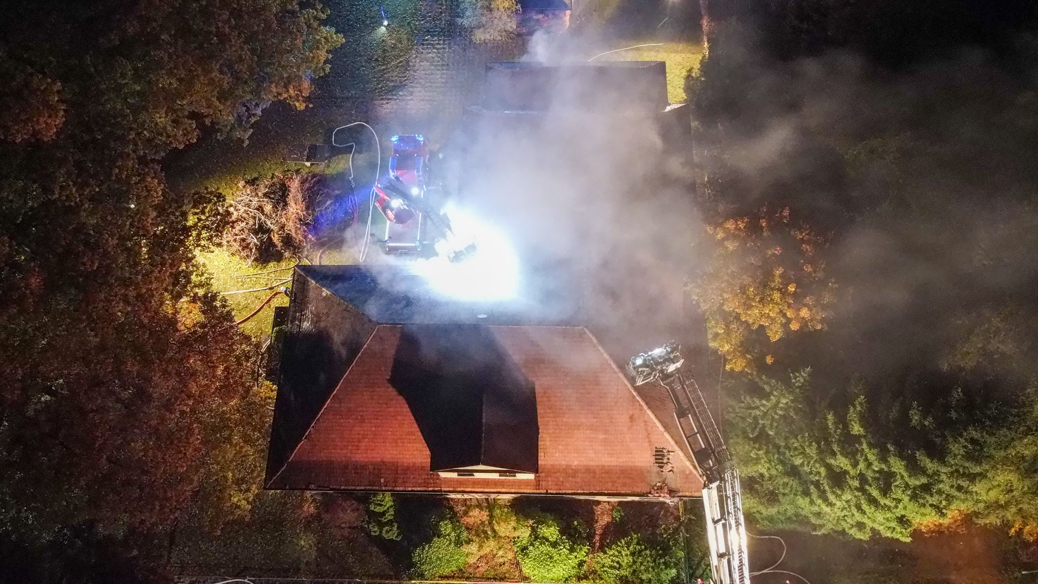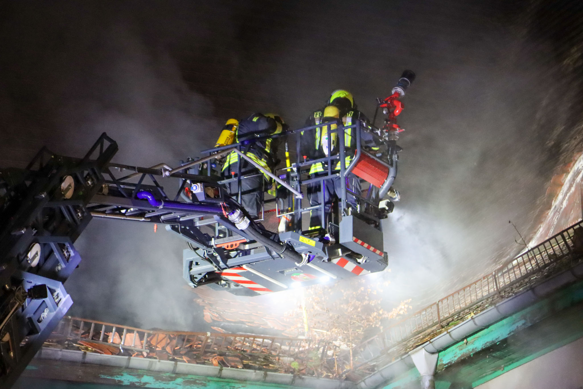 Insgesamt waren mehr als 50 Feuerwehrleute bei dem Großbrand im Einsatz, darunter mehrere Atemschutzgeräteträger. Die Einsatzstelle musste aufwendig ausgeleuchtet werden, da der Brandherd schwer zugänglich war. Die Nachlöscharbeiten zogen sich bis in die Mittagsstunden hin.