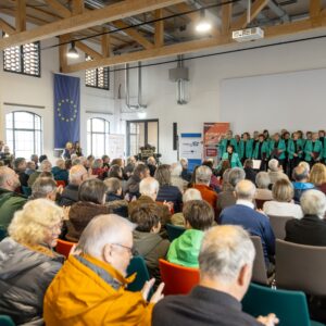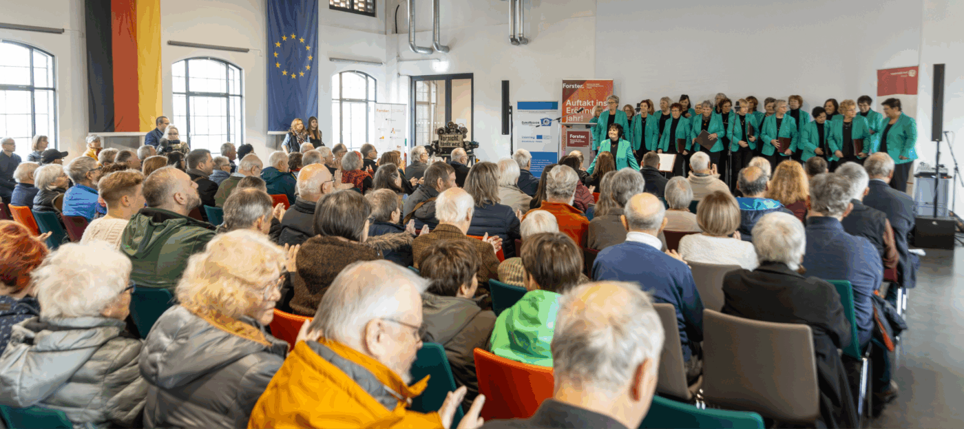 Sehr viele Menschen Menschen sitzen in einem Saal des Forster. Museum für Textil- und Industriegeschichte und hören einem Chor zu, der an der Spitze des Raums steht