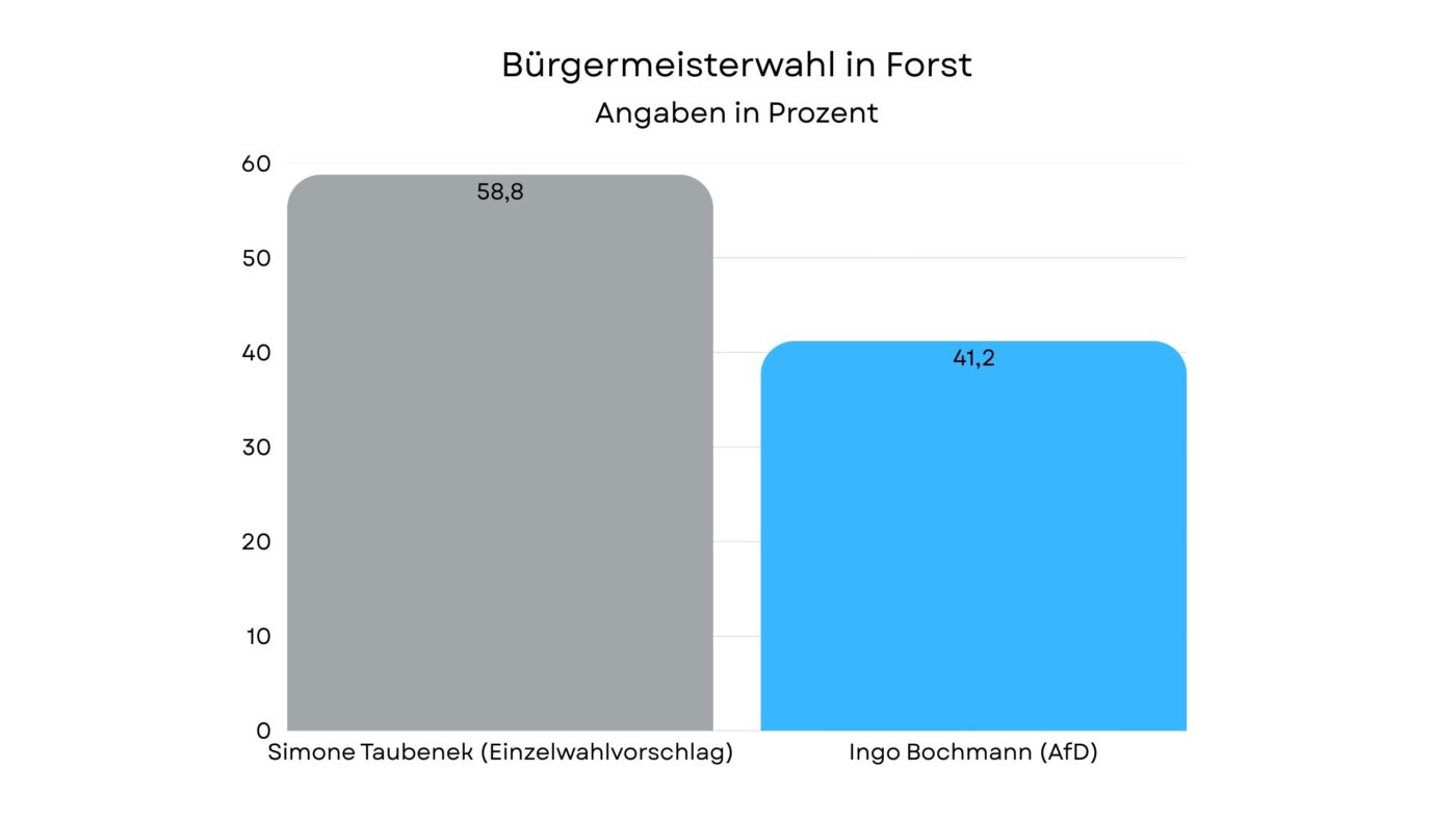 Bei der Bürgermeisterwahl Forst hat die bisherigen Amtsinhaberin das Vertrauen der Wähler erneut erhalten. In Forst setzte sich Simone Taubenek (parteilos) klar gegen ihren Herausforderer Ingo Bochmann (AfD) durch. Taubenek erhielt 58,8 Prozent der Stimmen und damit 4.980 Stimmen. Bochmann kam auf 41,2 Prozent beziehungsweise 3.495 Stimmen. Taubenek steht bereits seit acht Jahren an der Spitze der Stadtverwaltung und kann ihre Arbeit nun fortsetzen. Das Ergebnis gilt derzeit noch als vorläufig und wird in der kommenden Woche offiziell bestätigt. Die Wahlbeteiligung in Forst lag bei 58,9 Prozent.