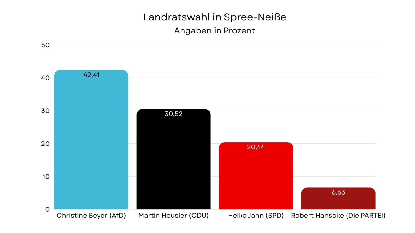 In der Landratswahl Spree-Neiße Stichwahl treten Christine Beyer (AfD) und Martin Heusler (CDU) gegeneinander an. Beyer erhielt im ersten Wahlgang 42,41 Prozent der Stimmen. Insgesamt 21.688 Wählerinnen und Wähler entschieden sich für sie. CDU-Kandidat Martin Heusler kam auf 30,52 Prozent. Das entspricht 15.607 Stimmen.