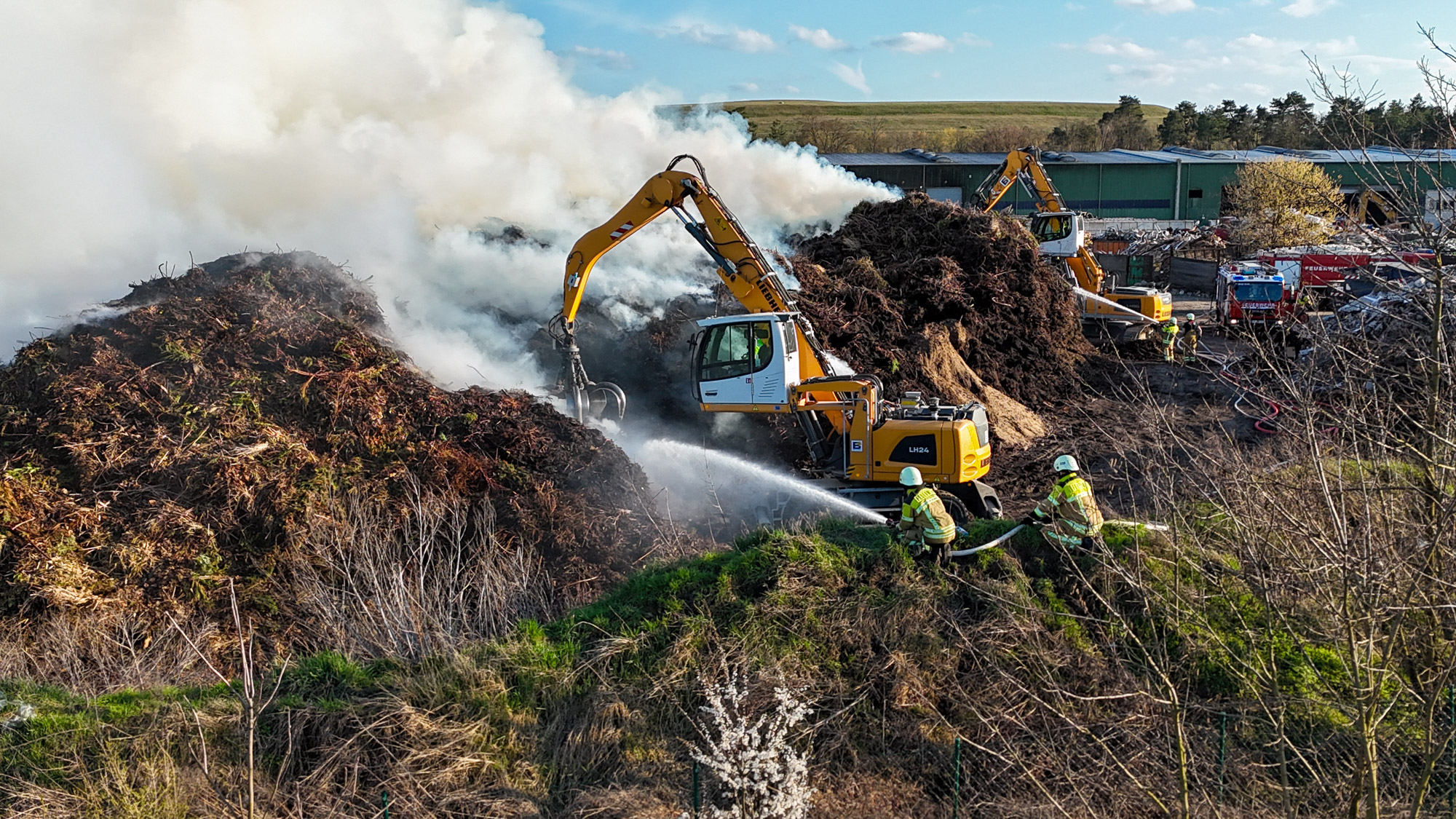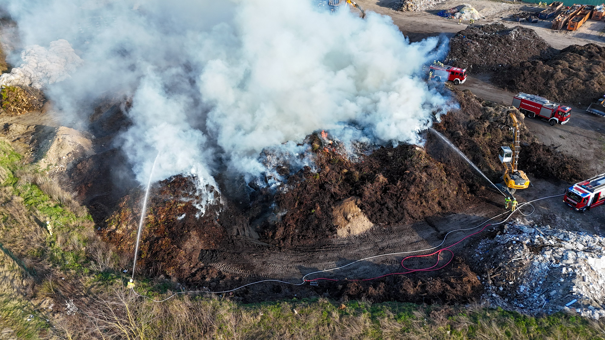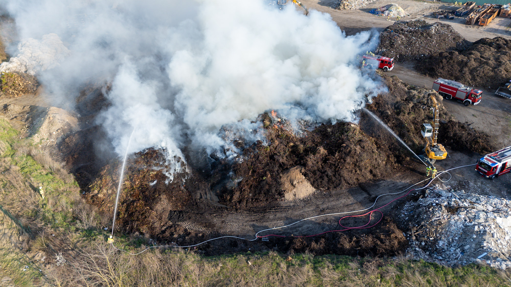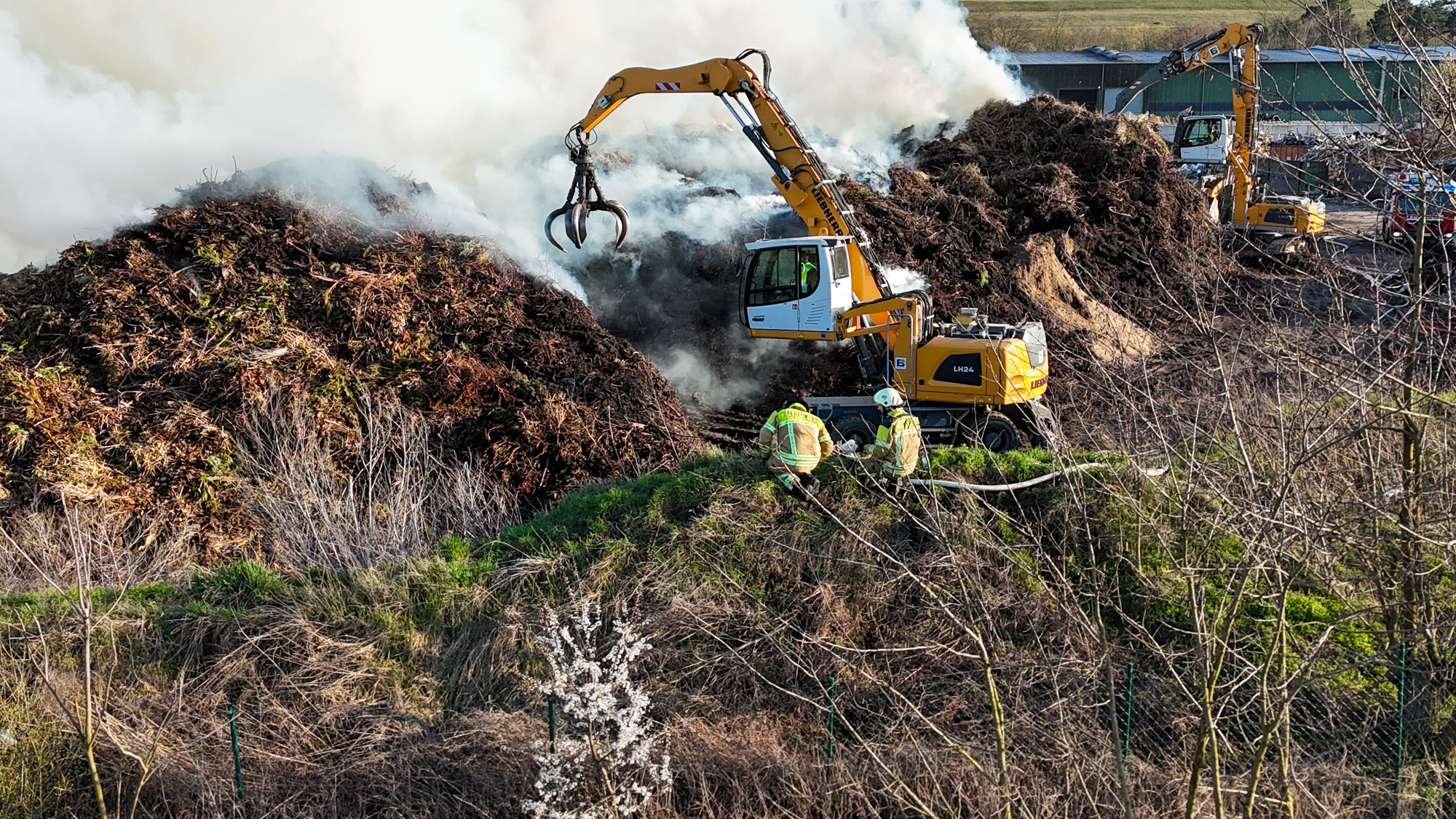 Zur Unterstützung wurden zusätzliche Kräfte nachalarmiert. Auch das Unternehmen selbst half aktiv mit: Mit schweren Maschinen wurden die brennenden Abfallhaufen auseinandergezogen, um gezielt löschen zu können.