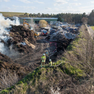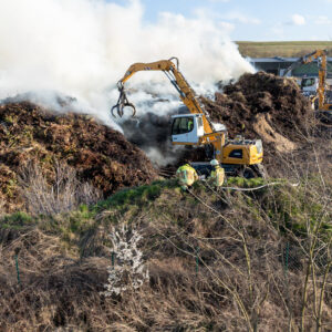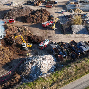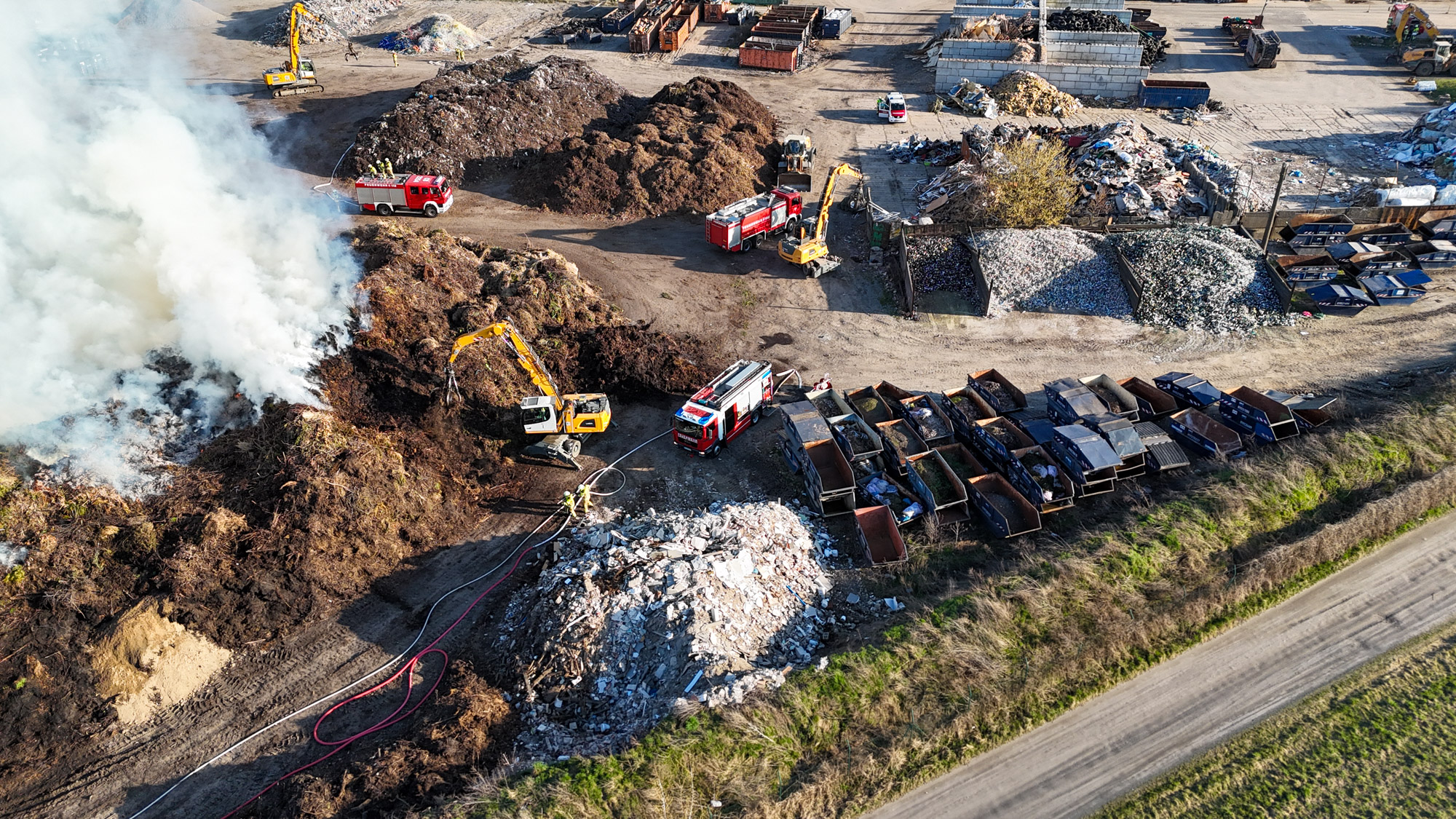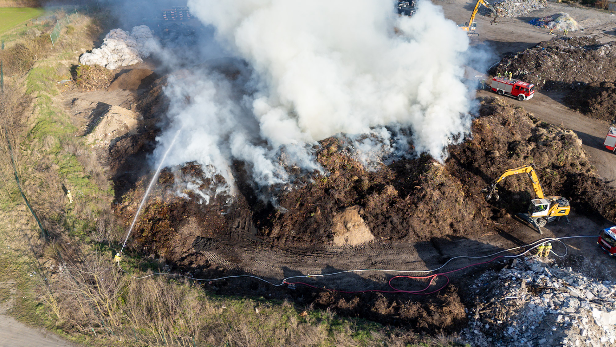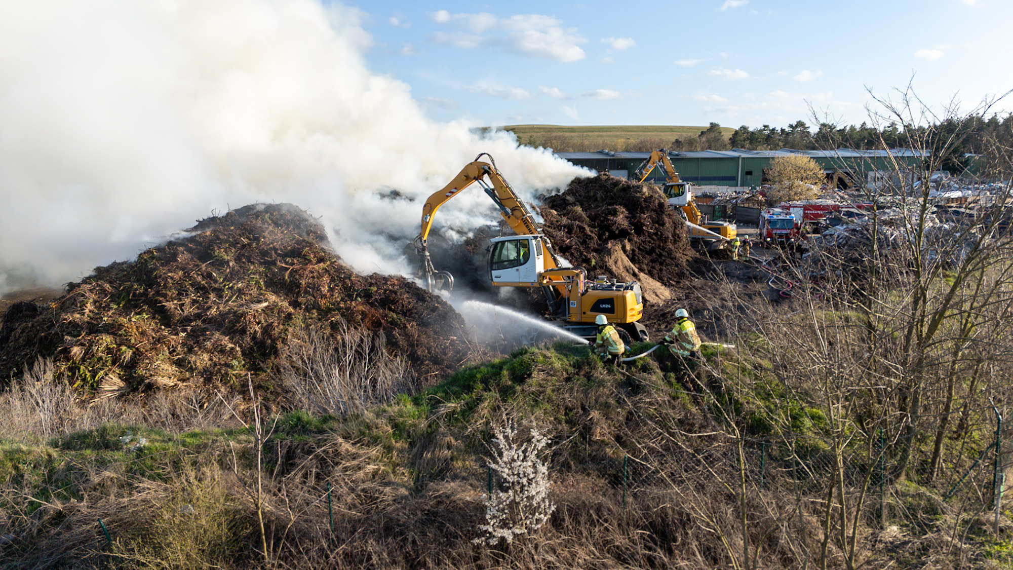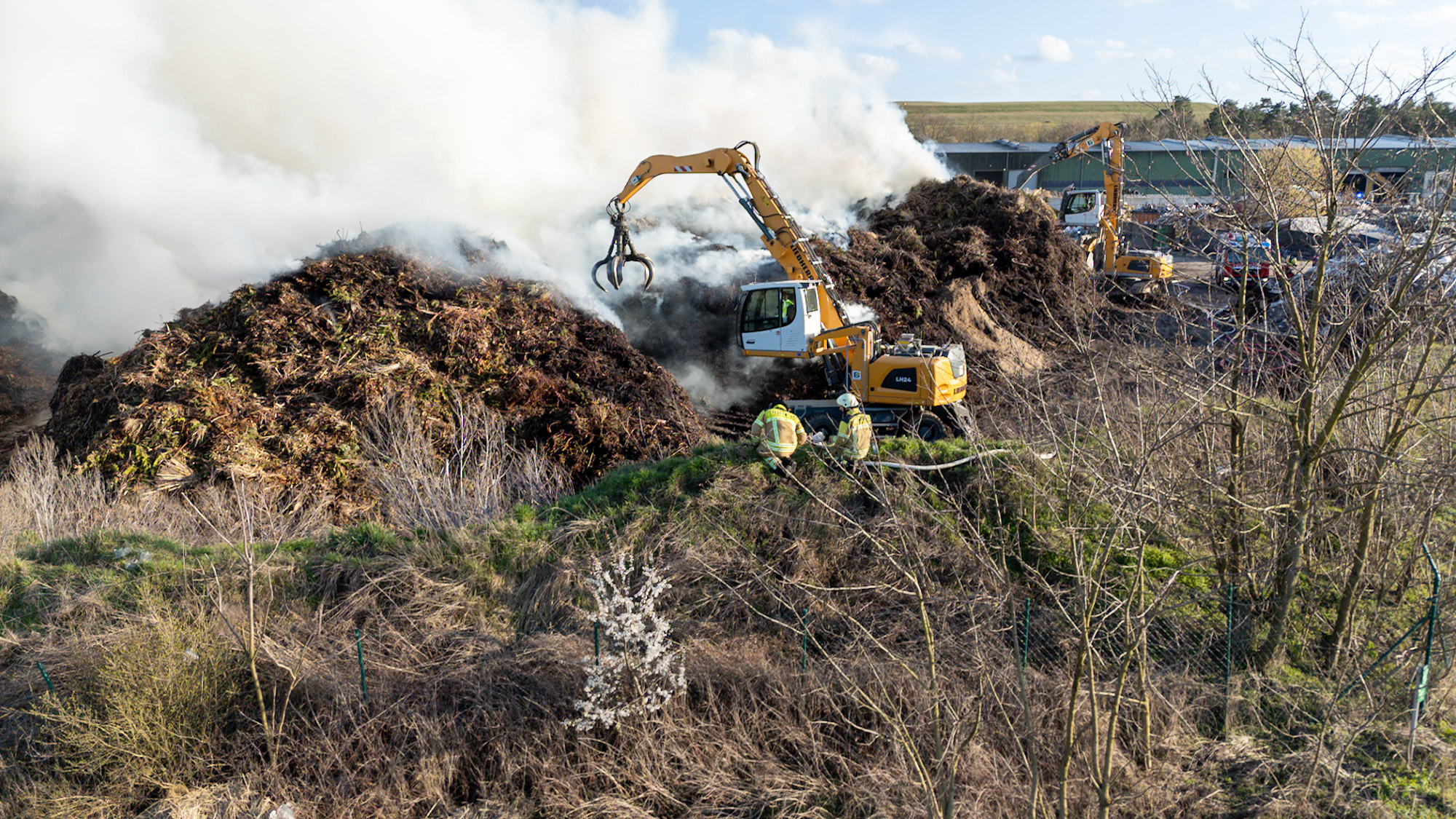 Zur Unterstützung wurden zusätzliche Kräfte nachalarmiert. Auch das Unternehmen selbst half aktiv mit: Mit schweren Maschinen wurden die brennenden Abfallhaufen auseinandergezogen, um gezielt löschen zu können.