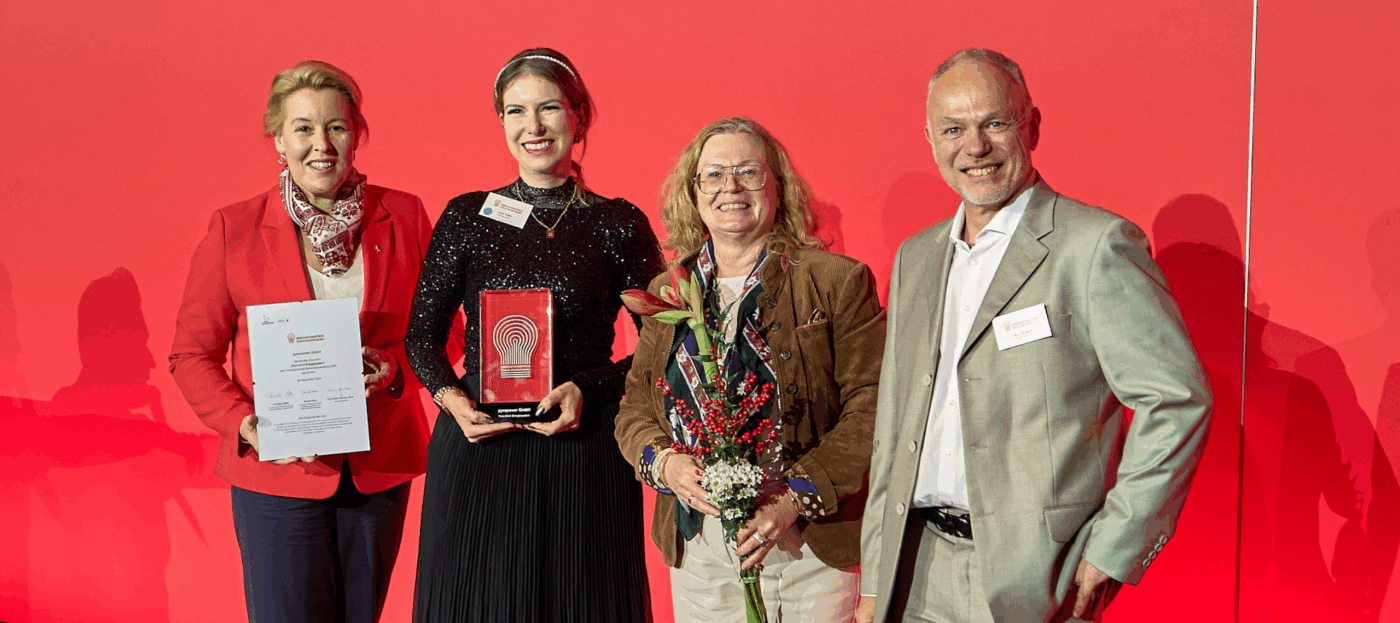 Der Innovationspreis 2025 geht an Lucie Töpfer von der Pyropower GmbH aus Cottbus, die den Preis auf der Bühne in den Händen hält